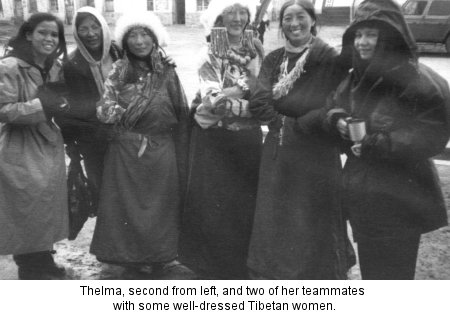 One of the women knew a little Mandarin, and a German woman, married to a Tibetan who joined the team in Hong Kong, spoke a little Tibetan. In spite of the language barrier Thelma felt they left a fragrance of the love of God as they befriended Tibetans, drank tea in their homes and passed out literature in the vernacular. Tow women professed salvation after reading the gospel literature. Whereever they went they prayed that the love of Christ would break into this Buddhist stronghold.