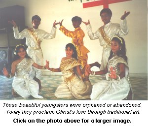 Noren joined a Cambodian church in Chicago and soon was active in teaching and preaching in a house church. There she met Gioia Michellotti, an American woman who loved the Cambodians "more than they love themselves." When Noren heard Gioia singing in Cambodian and encouraging Cambodians to relearn the beautiful art forms they'd lost under Communism, it touched a chord in Noren's heart. Cambodians love art, music and dancing, and she realized here was a way to present Christ so Cambodians would understand. They wouldn't think it was crazy to preform the graceful motions of hands and feet to tell the story of Jesus' love to traditional music.